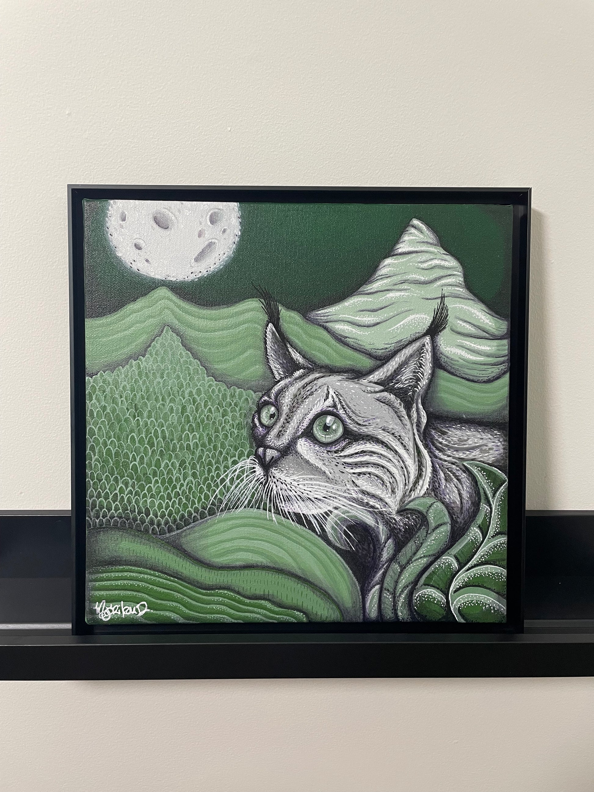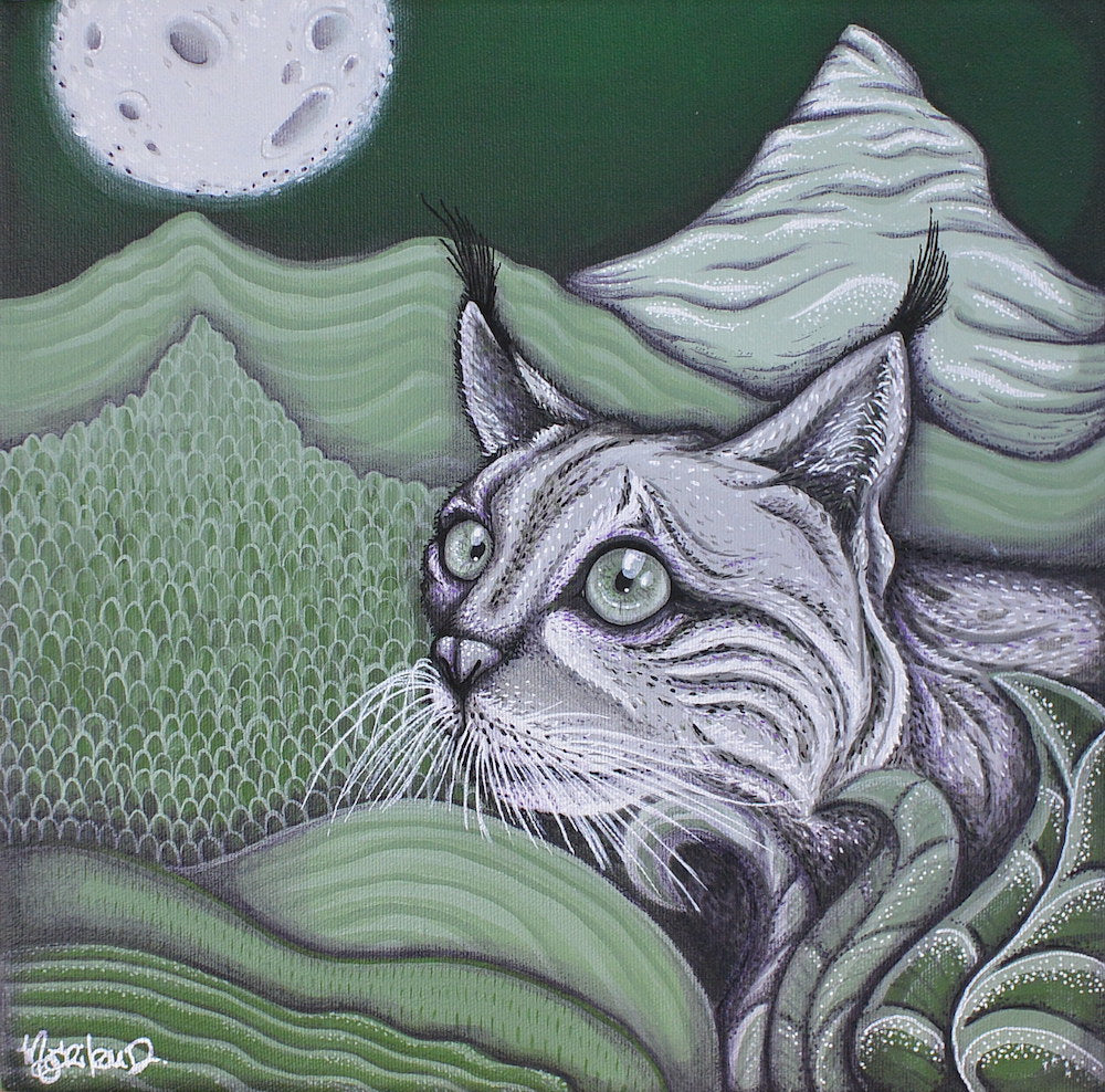 This majestic lynx, immersed in serene contemplation, embodies tranquility amidst a lush, lunar landscape. Its piercing gaze invites us to slow down and appreciate the quiet moments, reminding us that wisdom lies in the careful observation of nature.